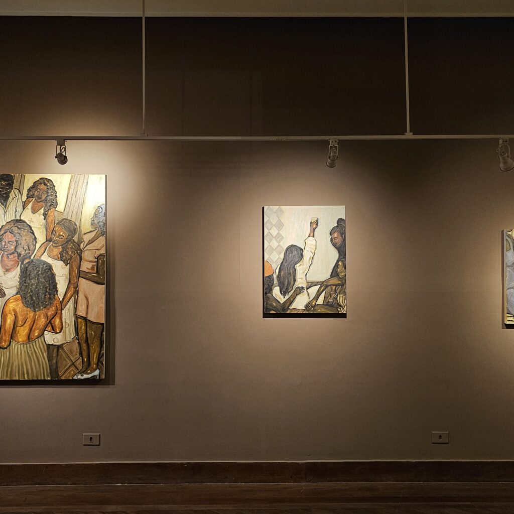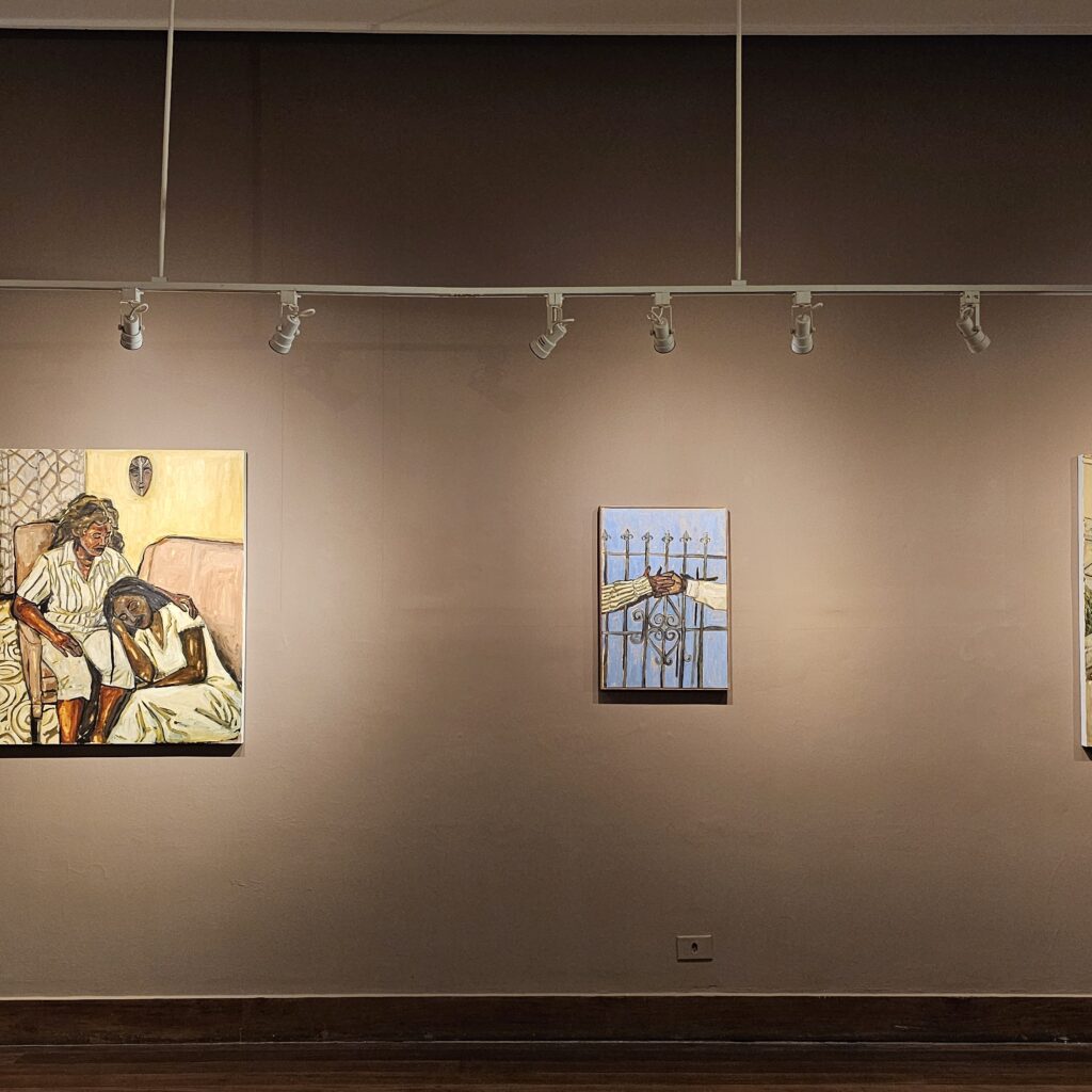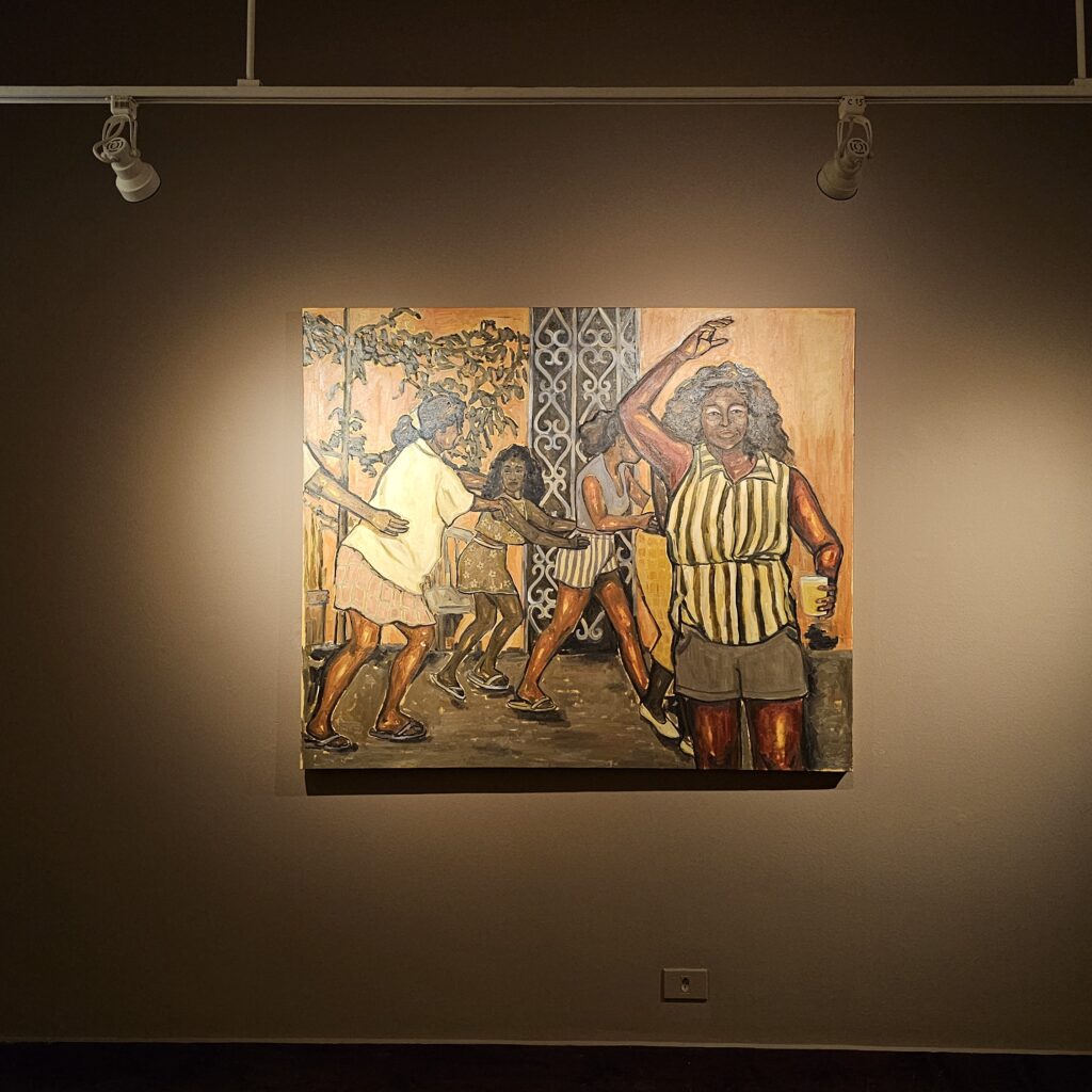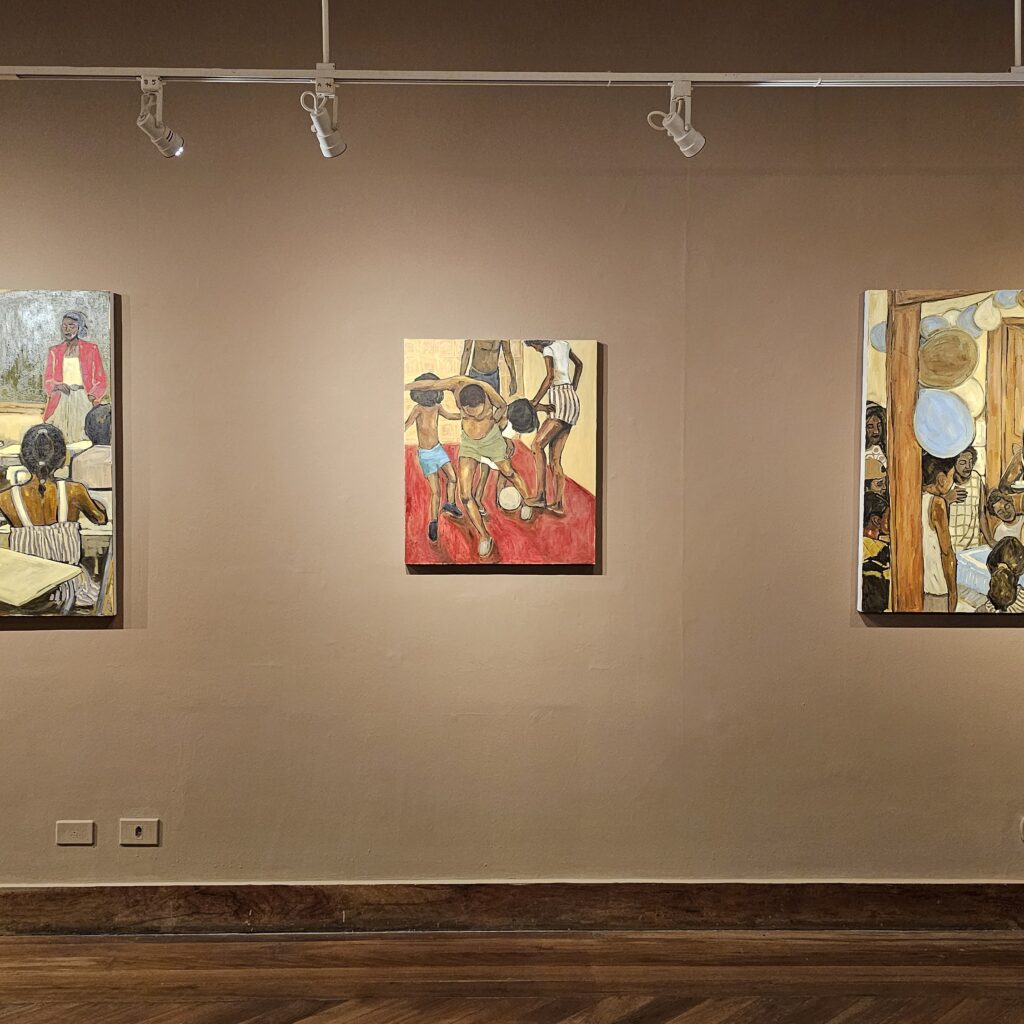 Reunindo pinturas em óleo sobre tela, desenhos, instalação e vídeo, a exposição constrói uma narrativa poética que mistura lembrança, imaginação e cotidiano. As obras destacam cenas de convivência, trabalho, celebração, cuidado e superação — registros sensíveis da presença negra no litoral paulista.